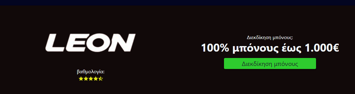 Το Leon Casino προσφέρει μπόνους 150% στην πρώτη κατάθεση έως 1.500€, μαζί με 10 δωρεάν περιστροφές. Ο απαιτούμενος στοιχηματισμός είναι x30 και πρέπει να ολοκληρωθεί μέσα σε 14 ημέρες από την ενεργοποίηση.